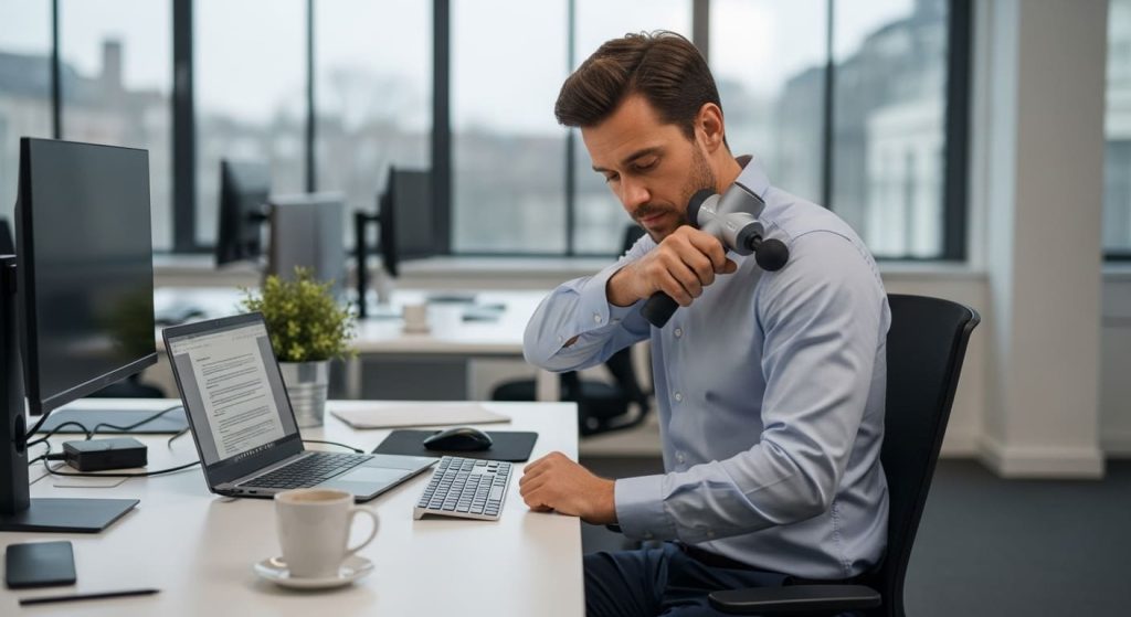 Vegyél részt a hosszú asztali napok utáni megkönnyebbülésben! Ülőmunka közbeni stresszoldás és fájdalomcsillapítás masszázspisztollyal. Fedezd fel!